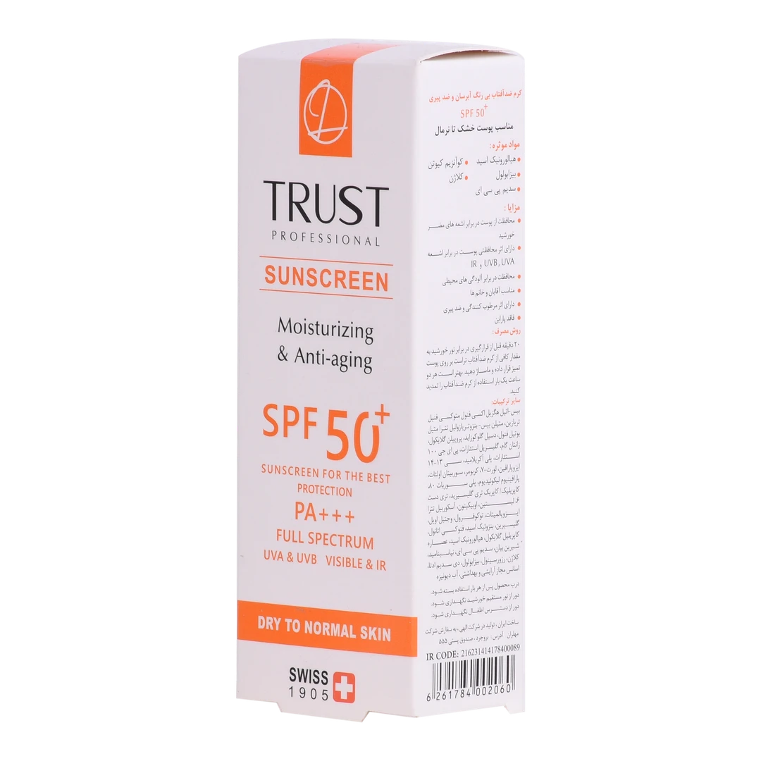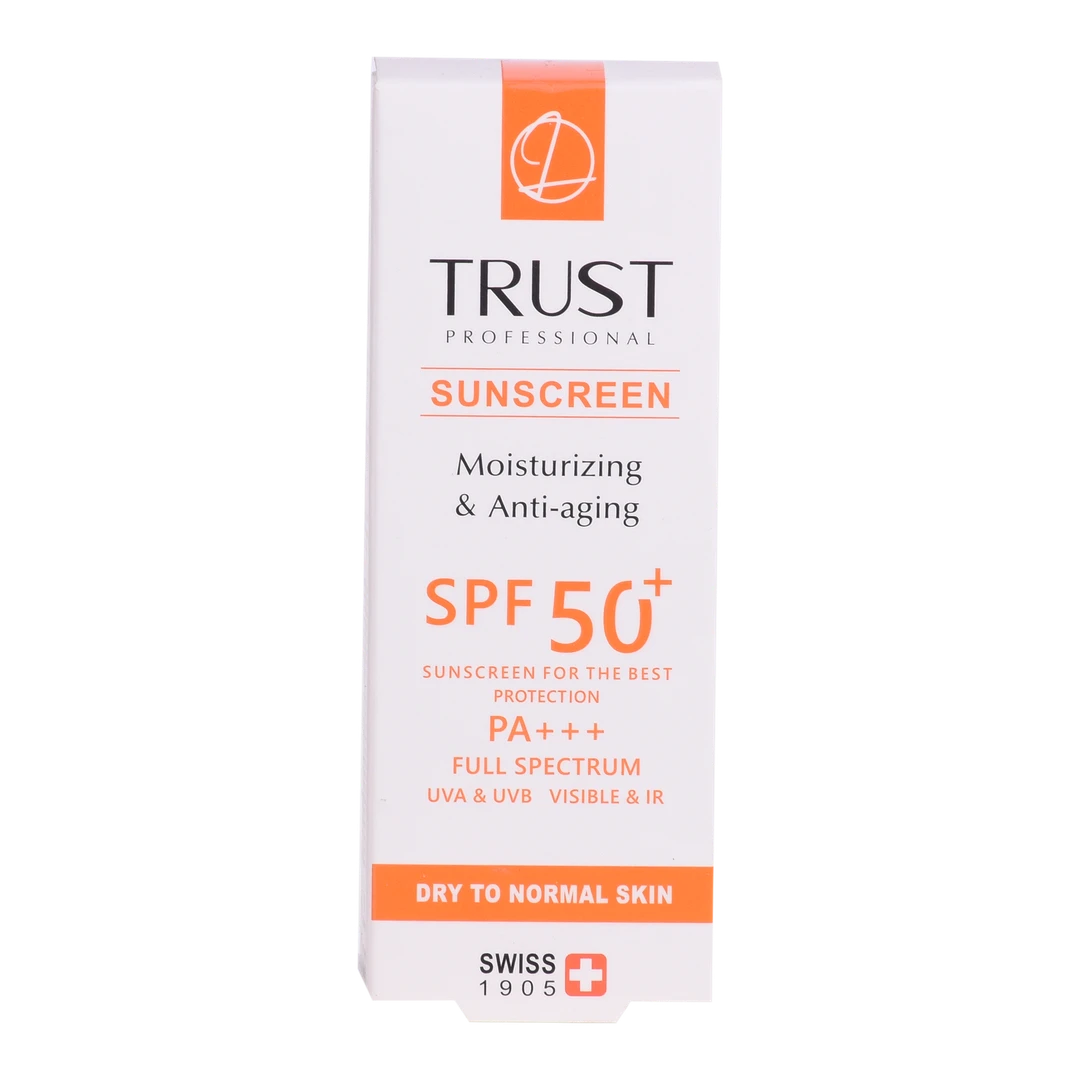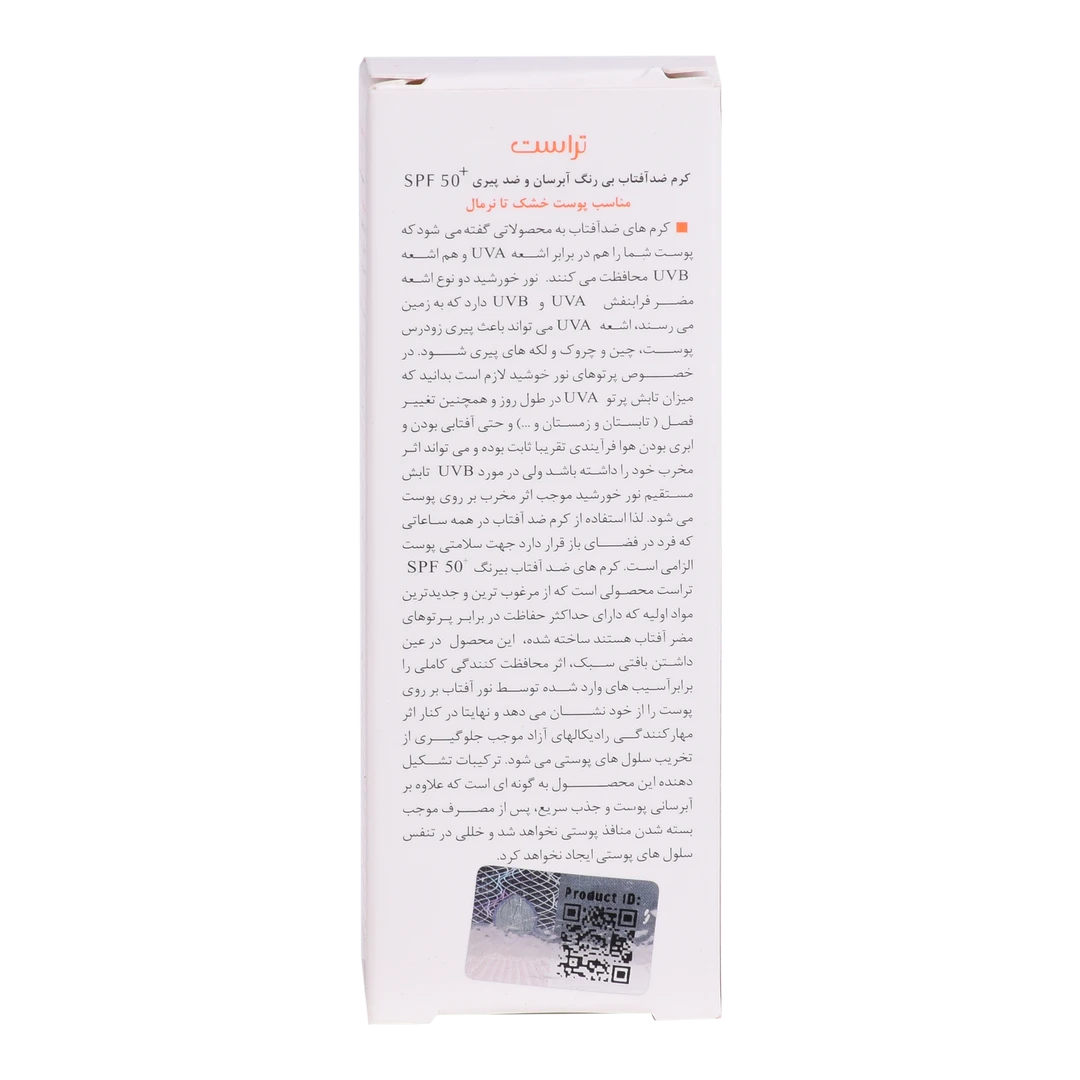 کرم ضدآفتاب و ضدپیری SPF +50 تراست، با استفاده از مرغوبترین و جدیدترین مواد اولیه همچون هیالورونیک اسید و کوآنزیم کیوتن از پوست شما دربرابر پرتوهای مضر آفتاب به طور کامل محافظت میکند. این کرم علاوه بر مهار رادیکالهای آزاد و محافظت از پوست دربرابر آلودگیهای محیطی، از تخریب سلولهای پوستی، بروز چینوچروک، پیری زودس و لکهای ناشی از آفتاب نیز جلوگیری میکند. این محصول بافتی سبک داشته و با قابلیت جذب سریع و آبرسانی قویِ پوست خشک و حفظ رطوبت آن، پس از مصرف منافذ پوستی را نبسته و هیچ خللی در روند تنفس سلولهای پوستی ایجاد نمیکند.