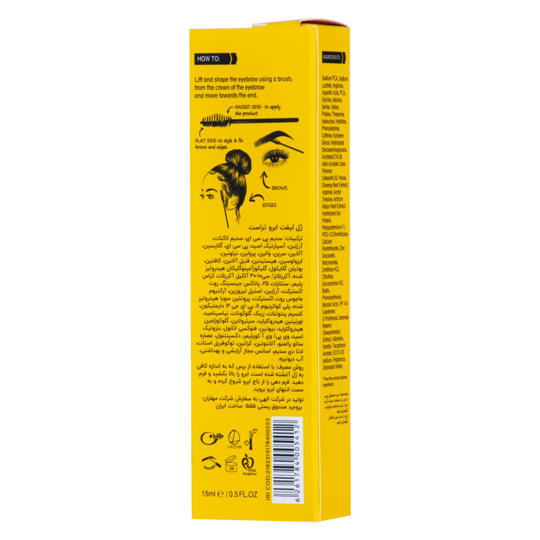 با استفاده از برس که به اندازه کافی به ژل آغشته شده است، ابروی را بالا بکشید و فرم دهید. فرم دهی را از تاج ابرو شروع کرده و به سمت انتهای ابرو بروید.