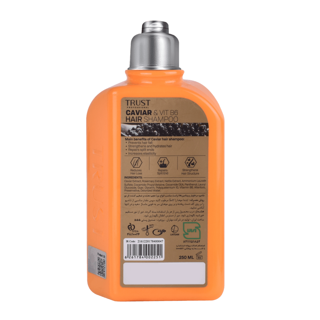 شامپو سر خاویار و ویتامین B6 تراست، با داشتن عصاره خاویار و رزماری، موجب تقویت تارهای مو و افزایش رشد آنها میشود. همچنین این محصول فاقد پارابن و سدیم لوریل سولفات (SLS) بوده و از آسیب به تارهای مو پیشگیری میکند. با استفاده از این شامپو میتوانید تارهای موی خود را ضخیم کرده و حجم آنها را افزایش دهید.