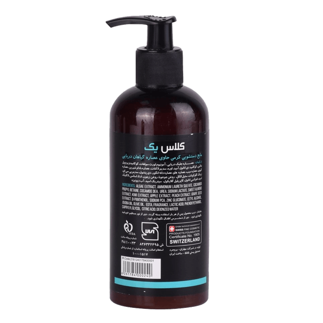 مایع دستشویی کرمی کلاس یک حاوی عصاره گیاهان دریایی، شویندهای عالی برای پاک کردن تمام آلودگیها از روی پوست است. این محصول، با داشتن عصاره جلبک دریایی، یک ضدالتهاب و مرطوبکننده عالی برای پوست است. علاوهبر این، ترشح چربی در پوست را کنترل کرده و پوست شما را روشن میسازد. همچنین این محصول، از فرآیند ترمیم طبیعی پوست حفاظت و پشتیبانی میکند.
